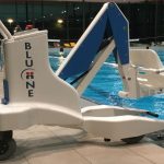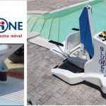 - RÁPIDO : ele não precisa de qualquer fixação ao solo e é fácil de usar. A pessoa que se senta no assento na parte da frente e é empurrado para a borda da piscina. Basta accionar o travão e bloquear na posição (caso contrário, a máquina não funciona) e pressione o botão para baixo e o nadador é abaixado na piscina.