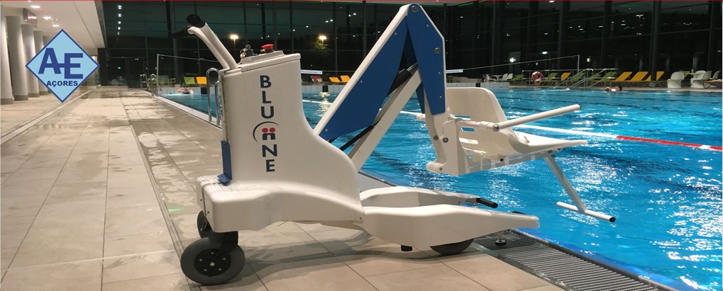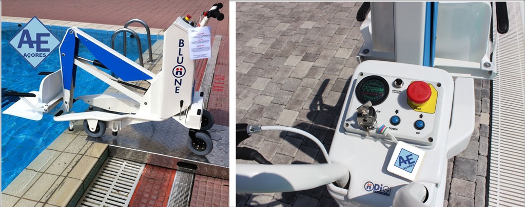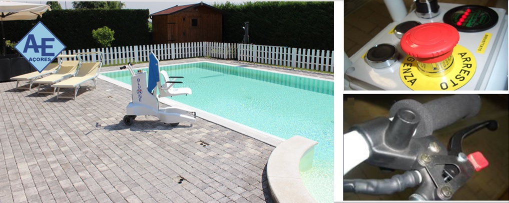- RÁPIDO : ele não precisa de qualquer fixação ao solo e é fácil de usar. A pessoa que se senta no assento na parte da frente e é empurrado para a borda da piscina. Basta accionar o travão e bloquear na posição (caso contrário, a máquina não funciona) e pressione o botão para baixo e o nadador é abaixado na piscina.